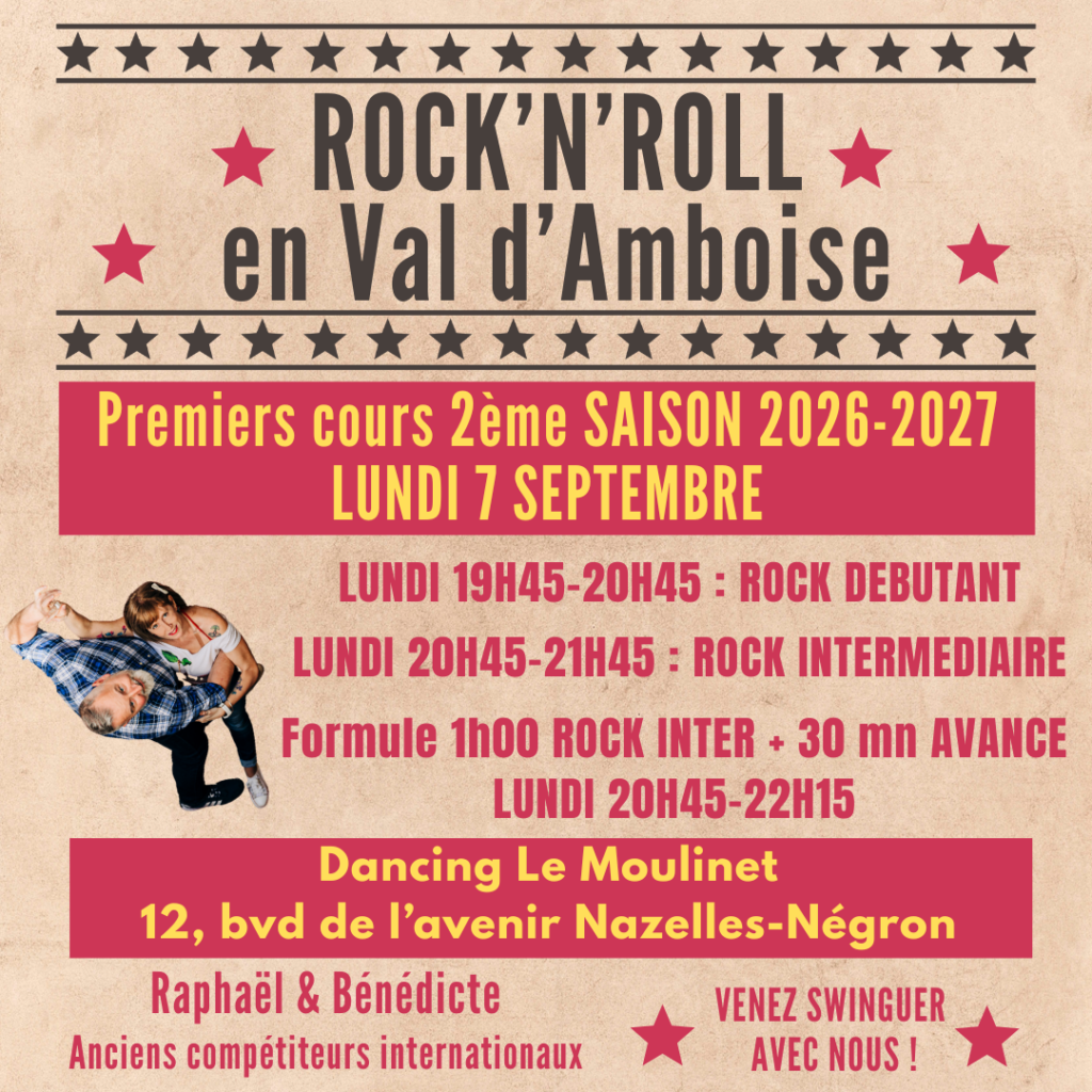 Nous sommes extrêmement heureux de vous annoncer que nous continuerons à vous proposer des cours de Rock/Rock’N’Swing dans le Val d’Amboise le LUNDI SOIR, pour la saison 2026-2027, au Dancing Le Moulinet à Nazelles Negron ! Merci à eux de nous permettre de louer leur très belle salle.